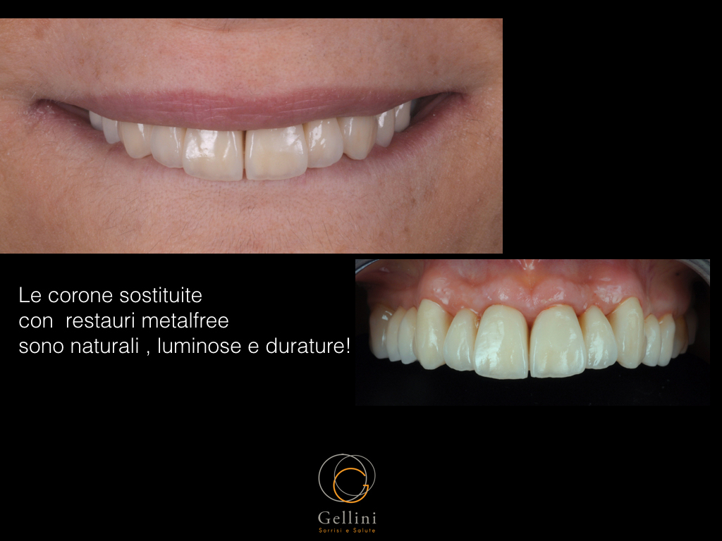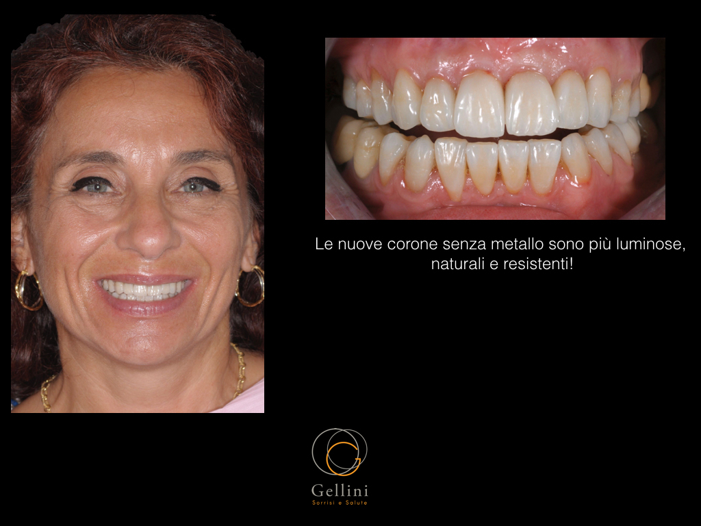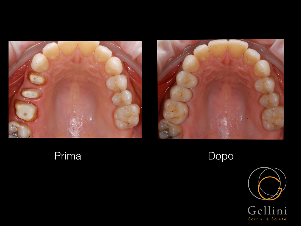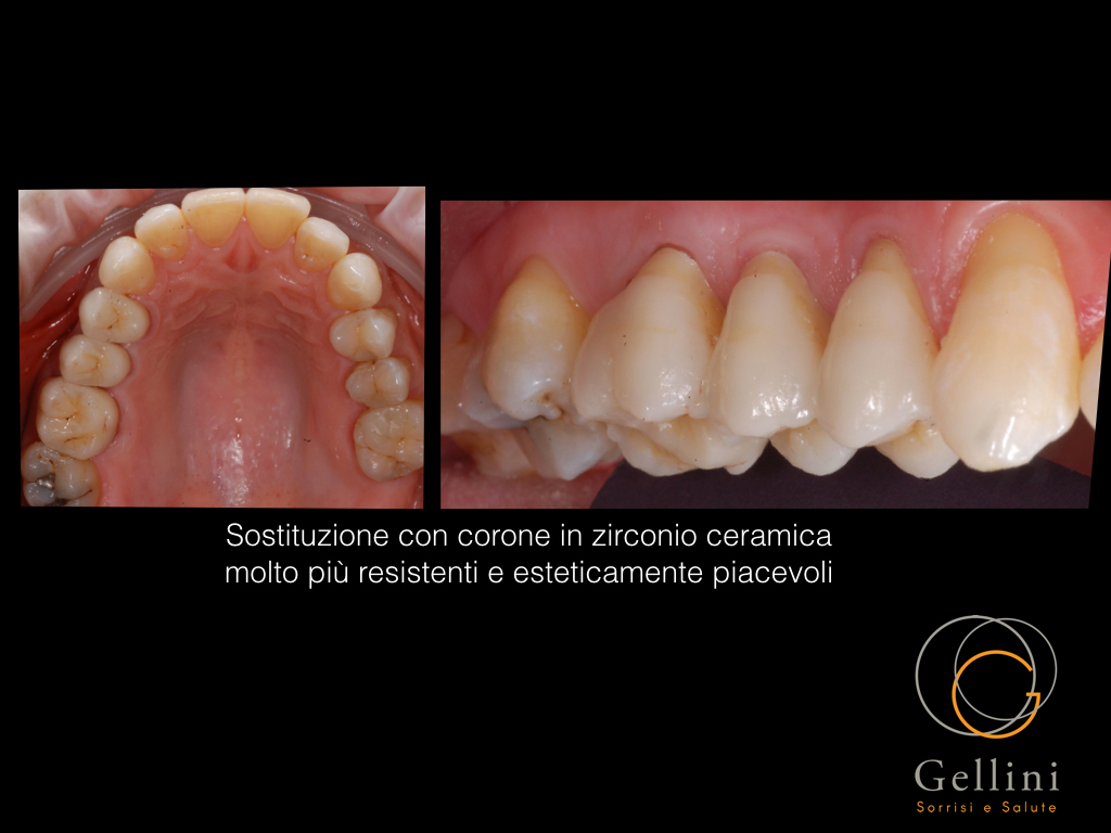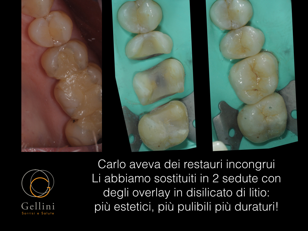 Come siamo intervenuti: In solo 2 sedute abbiamo sostituito i precedenti lavori con degli Overlay in disilicato di litio, che risultano più pratici per l’igiene orale, più duraturi ed esteticamente più piacevoli.